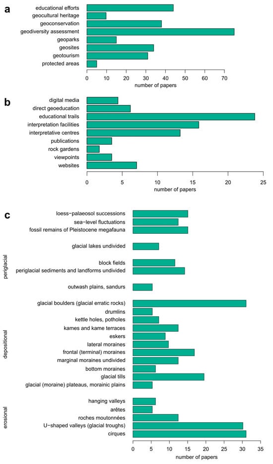 Topics related to Pleistocene geodiversity, covered in the reviewed papers. (a) Research themes. (b) Educational initiatives described in the papers. (c) Sediments and geomorphological features.