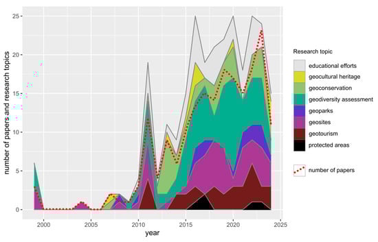 The volume of research on Pleistocene glacial geodiversity is growing steadily, with 119 (60.4%) papers published during the period 2011–2020 and 67 (34.0%) papers published between 2021 and 2024 (Figure 6). The number of studies and research topics shows significant variation among years, with a notable peak in 2011. Starting in 2015, the number of papers exceeded 10 each year. Despite some variation, the volume of studies published after 2020 reveals only a slight increase. There is no sign of significant further growth of the number of research topics, showing that recent studies are more theme-specific than in the early years of this research area. The percentage of research items focused on geosite designation and geodiversity assessment decreased from 55% between 1999 and 2010 to 22.8% during the period 2011–2020, but subsequently increased to 46.3% between 2021 and 2024. The proportion of papers dedicated to geoconservation increased from 9% (1999–2010) to 22.8% (2011–2020). Research on educational strategies flourished, with the number of published papers rising from one prior to 2010 to 30 (25.2%) during the decade 2011–2020. However, on the scale of a year, no significant increase in the number of studies focused on scientific communication has been noted between 2015 and 2022. Recent years have witnessed an increase in the number of papers related to geotourism, from zero papers published prior to 2010, through 18 (15.1%) published sources for the period 2011–2020, to 12 (17.9%) papers for 2021–2024. A less pronounced increase is noted in studies of Pleistocene geoheritage in existing and planned geoparks (eight papers published between 2021 and 2024; 11.9%).