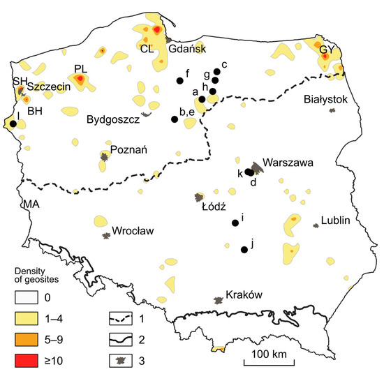 Density (per 100 km2) of geosites associated with Pleistocene geodiversity, included in the Central Register of Polish Geosites. (1) Limits of glaciation during the Last Glacial Maximum; (2) Southern limits of Pleistocene glaciations; (3) Major urban centers; (a–l) Locations of erratic boulders and rock gardens discussed in the text. Locations referenced in this contribution: BH—Bukowe Hills, CL—Cassubian Lakeland, GY—Geopark Yotvings, MA—Muskau Arch Global UNESCO Geopark, PL—Postglacial Land of the Drawa and Dębnica Rivers, SH—Szczecin Heights.
