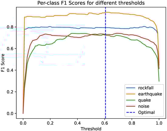 Classification is performed on an unseen dataset (test set) by choosing an ‘anchor’ from the training set for each class. In a fully supervised approach, during testing, the anchor would be selected by the user/expert. As noted previously, this is time-consuming and subjective for microseismic signals. Instead, for a semi-supervised approach, we take a data-driven approach to choose an anchor from each class which scores the highest accuracy among its peers. Specifically, we take the highest F1-score within in-training for each class. Note that the F1-score is a standard classification metric, which is the harmonic mean of precision and sensitivity, providing a balanced measure that considers both number of wrongly detected events and the number of missed events—see [] on how to calculate F1-score for seismic classification. This is important as a label in the training set may be incorrect or the signal-to-noise ratio too low to perform well. It is also possible to provide multiple anchors of the same class to create an aggregate score, which will provide better generalisation (assuming that all of the class anchors are similar) but at the expense of processing time.