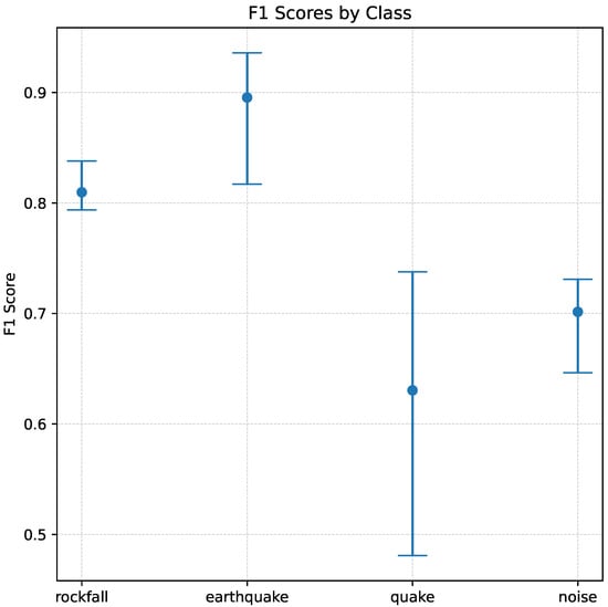 Figure 4 shows the effect that 5-fold validation has on performance. F1-scores for rockfall and earthquake events remain high between folds showing that the data variation between training and validation sets makes little difference to the final performance. Noise performs worse, but has a similar spread in F1-scores. The noise class contains a number of different sub-events which are detected across the training-validation set and therefore it is understandable that changes between folds do not affect performance significantly. Micro-quake events have the greatest spread in performance between folds. Indeed, the micro-quake class has the most varied amount of signal-to-noise ratio and with very short event times; thus, a sub-set of events could be considered more challenging than others as represented by a large spread in F1-scores with the worst being below 0.5. Of the five folds, the best model weights were chosen from fold 3 which had the average F1-scores: rockfall: 0.79; earthquake: 0.94; micro-quake: 0.72; noise: 0.73.