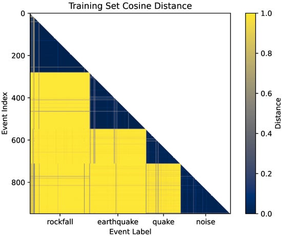 Figure 2 shows that all three distance metrics performed well, in terms of F1-score, on rockfall and earthquake classes. However, as expected, the network struggles with the micro-quake class, which is often labelled with uncertainty in relation to the noise class, as discussed in reference to Table 1. Consistently, the cosine distance function resulted in the best F1-scores across all classes, which is expected since it is less sensitive to magnitude distances, and will be used from now on.