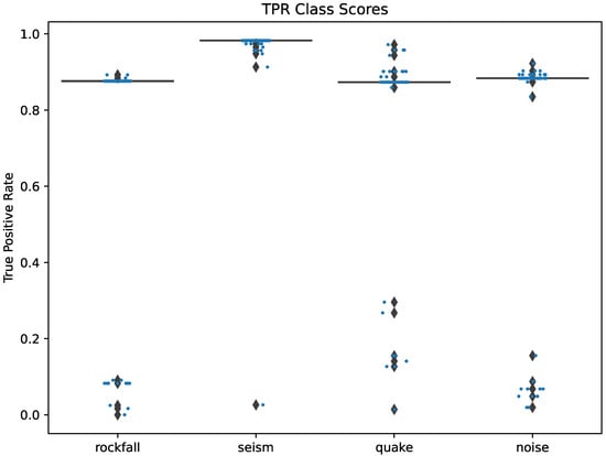 Specifically, Figure 8 shows the sensitivity per event compared against all others in its class. A rockfall which is similar to all other rockfalls would have a high sensitivity, and would be a good anchor, while a rockfall which is unique or highly distinct from others would have a great number of misclassifications and therefore a low accuracy and be a bad anchor. It can be seen that earthquake (seism) has only one event which is poor, whereas the other classes have more than one. This is expected since earthquakes have well-defined features and always demonstrate very good performance in the literature. Rockfall has one event which has no true positives, with an event start at 2015-07-07 19:32:49.42.