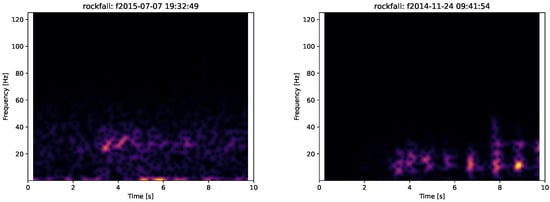 Table 1 shows four types of labelled events available. Rockfalls mainly occur at the main scarp of the landslide, where the rigid block falls from the steep slope (height > 100 m), characterised by distinctive impacts over several seconds. The earthquakes represent regional seismic events in this area and the teleseisms; earthquake events have triangular spectrogram components with reducing high-frequency content ranging from 2–50 Hz. Micro-earthquakes (also called micro-quakes) are likely to be triggered by material damage, surface cracks and openings and are very short events less than 5 s. N/A noise events include all anthropogenic and environmental noise, due to, e.g., transportation, pedestrian walking, heavy rain, animals, strong wind, etc., that can last tens of seconds and generally have higher frequency range between 0 and 100 Hz and very distinct spectral patterns. Note that the events in the Résif catalogue can be as low as 2 Hz. Please refer to [], which provides a description and visualisation, in time and frequency domains, of the four types of events, considered in this study, and references therein for more details about the site’s endogenous seismicity.
