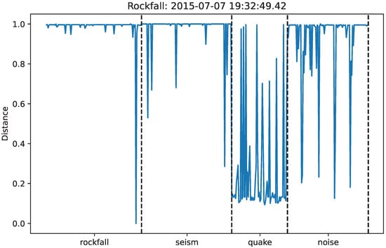 Figure 6 shows the distance across time when running on continuous data: the vertical axis shows the detection for every anchor in the training set, while the horizontal axis shows the time in seconds. The darker the colour, the smaller the distance between the test window and the used anchor. The 10 s window is moved across a 30 s period where the event start time is at 0. We confirm that event detection is in line with the relative duration of events, as per the catalogue reported in Table 1. Indeed, the rockfall can be detected for a large window of time (around 16 s), while micro-quake is very exact at roughly 2.5 s. For earthquakes, the detection time is only around 6 s rather than the catalogued 13 s. This may be due to the network only detecting the initial wave arrivals and losing the signal as the power tails off, and is expected for micro-earthquakes.