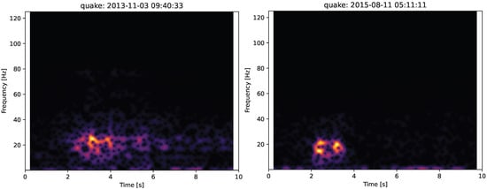 EQTransformer (EQT) [], is a deep encoder/decoder model, trained on the STanford EArthquake Dataset (STEAD), to detect earthquakes. EQT comprises an encoder, branching into three decoders, a detector and S-phase and P-phase pickers. EQT picks/detects arrivals from the raw input signal in the time domain and was tested on the Japanese Meteorological Agency HiNet dataset, showing that it can detect magnitudes of around 1.5–1.8 M, although it is capable of detecting smaller microearthquakes with high-resolution network coverage and smaller station spacing. The majority of literature [,,] employs EQT to detect only earthquakes or ‘noise’ (i.e., everything else) using the time domain rather than the frequency domain signal representation. In [], large pre-trained image classification networks such as GoogLeNet, AlexNet and SqueezeNet, are adapted for binary classification of earthquake arrival.