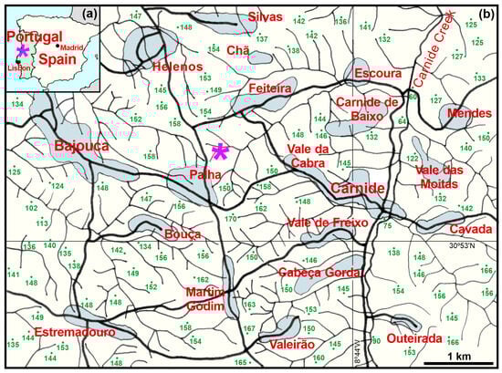 Geographical context of Vale Farpado (Pombal, west-central Portugal). (a) General location of the site in the Iberian context. (b) Location of the Vale Farpado in the Carnide area. A magenta asterisk indicates the location of Vale Farpado. Green numerical values represent elevation points in metres above sea level.