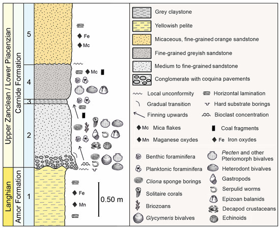 As in other correlative fossil sites with marine assemblages of the Carnide parish area, the lithofacies association is siliciclastic and finning-upwards in nature (Figure 2 and Figure 3a,b). The stratigraphic record is organised as a transgressive parasequence lying over a thick non-marine clayish bed (bed “1”) (Figure 2). It consists of a continuous, 0.50 m thick condensed bed (bed “2”), highly fossiliferous, beginning with a 0.15 m thick basal conglomerate rich in well-rounded clasts of basic rocks, quartz, and quartzite, along with pavements and lenses of disarticulated valves of medium-to large-sized bivalves, mostly belonging to genera Pecten and Ostrea (Figure 2 and Figure 3c,e). This is followed by greyish, fine to very fine sands (0.35 m thick), characterised by poorly sorted and highly asymmetrical grains [30] (Figure 2 and Figure 3c,d). Bed “2” is overlain by a three-centimetre-thick layer of dark grey claystone (bed “3”) (Figure 2). Bed “4” (0.25 m) consists of fine-grained yellow to light brown fossiliferous sands containing abundant articulated specimens of Lissochlamys excisa (Figure 2). The top of the fossiliferous section at Vale Farpado is covered by a siliciclastic unit composed of well-sorted siltstones and finely graded sandstones [30] (Figure 2).