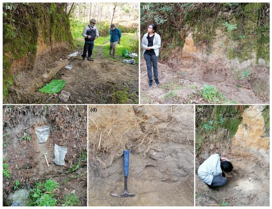 The early Pliocene fossil site of Vale Farpado (Pombal, west-central Portugal). (a,b) Panoramic views of the section during field-work procedures, showing the local exposure of Carnide Fm (beds “2” to “5”). (c) Detail of the basal conglomerate and sandstone facies of bed “2”, with bulk-samples collected for micropalaeontological analysis. (d) Detail of the highly fossiliferous grey sandstone facies of bed “2”. (e) Sampling the rich coquina with Ostrea, Pecten, and Glycymeris valves from the basal conglomerate of bed “2”.