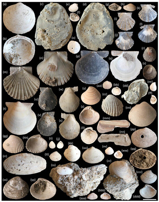 Marine Pliocene Bivalvia from the Vale Farpado fossil site (Carnide, Pombal, west-central, Portugal). (a) Glycymeris glycymeris lv, elv (DCT-VFa-B132). (b) G. glycymeris lv, ilv (srn). (c) Ostrea edulis rv, elv (DCT-VFa-B124). (d) O. Edulis rv, ilv (srn). (e) Nucula nucleus lv, elv (DCT-VFa-B300). (f) N. nucleus lv, ilv (srn). (g) Lembulus pella rv, elv (DCT-VFa-B304). (h) L. pella rv, ilv (srn). (i) Flexopecten flexuosus lv, elv (DCT-VFa-B285). (j) F. flexuosus lv, ilv (srn). (k) F. flexuosus rv, elv (DCT-VFa-B288). (l) F. flexuosus rv, ilv (srn). (m) Pecten benedictus [juvenile] lv, elv (DCT-VFa-B290). (n) P. benedictus [juvenile] lv, ilv (srn). (o) Heteranomia squamula lv, elv (DCT-VFa-B305). (p) Lissochlamys excisa lv, elv (DCT-VFa-B112). (q) L. excisa lv, ilv (DCT-VFa-B244). (r) Pododesmus squama lv, elv (DCT-VFa-B153). (s) P. squama lv, ilv (srn). (t) L. excisa rv, elv (DCT-VFa-B252). (u) Mimachlamys varia lv, elv (DCT-VFa-B2). (v) M. varia lv, ilv (srn). (w) M. varia rv, elv (DCT-VFa-B3). (x) M. varia rv, ilv (srn). (y) Laevastarte fusca lv, elv (DCT-VFa-B6). (z) L. fusca lv, ilv (srn). (aa) Digitaria digitaria rv, elv (DCT-VFa-B295). (bb) D. digitaria rv, ilv (srn). (cc) Cardites antiquatus lv, elv (DCT-VFa-B66). (dd) C. antiquatus lv, ilv (DCT-VFa-B67). (ee) Coripia corbis rv, elv (DCT-VFa-B315). (ff) C. corbis rv, ilv (srn). (gg) Megacardita striatissima lv, elv (DCT-VFa-B47). (hh) M. striatissima lv, ilv (srn). (ii) Scalaricardita scalaris rv, elv (DCT-VFa-B333). (jj) S. scalaris rv, ilv (srn). (kk) Megaxinus transversus lv, elv (DCT-VFa-B158). (ll) M. transversus lv, ilv (srn). (mm) Ensis cf. siliqua lv, elv (DCT-VFa-B207). (nn) E. cf. siliqua lv, ilv (srn). (oo) Europicardium multicostatum rv, elv (DCT-VFa-B131). (pp) Arcopagia crassa lv, elv (DCT-VFa-B155). (qq) A. crassa lv, ilv (srn). (rr) Gari depressa rv, elv (DCT-VFa-B154). (ss) Gari tellinella lv, elv (DCT-VFa-B152). (tt) Gouldia minima rv, elv (DCT-VFa-B341). (uu) Mactra stultorum as, elv (DCT-VFa-B161). (vv) Varicorbula gibba rv, elv (DCT-VFa-B348). (ww) V. gibba rv, ilv (srn). (xx) Venus casina rv, elv (DCT-VFa-B157). (yy) V. casina rv, ilv (srn). (zz) Callista chione rv, elv (DCT-VFa-B149). (aaa) Corbula revoluta rv, ilv (DCT-VFa-B294). (bbb) C. revoluta rv, elv (srn). (ccc) Clausinella fasciata rv, elv (DCT-VFa-B310). (ddd) C. fasciata rv, ilv (srn). Abbreviations: as—articulated specimen; elv—external lateral view; ilv—internal lateral view; lv—left valve; rv—right valve; srn—same reference number. Scale bar = 2 cm (a–d,m,n,p,q,t,gg,hh,mm–ss,uu,xx–zz); 1 cm (e–l,o,r,s,u–ff,ii–ll,tt,vv,ww,aaa–ddd).