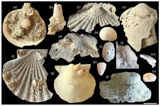 Besides bivalves, the molluscan assemblages of beds “2” and “4” from Vale Farpado fossil site locality also encompass representatives of Scaphopoda and Gastropoda (Figure 5b,h–j). Other macro-and mesofaunal components of the original biocenosis also include small solitary scleractinian corals assigned to the family Turbinoliidae, encrusting bryozoans, serpuloid polychaetes, balanomorph barnacles, regular echinoids, decapod crustacean fragments, and fish otoliths (Figure 4r and Figure 5d,f,g,k–n). In addition, both benthic and planktonic foraminifera are widely present [26,27,28,29,30]. The foraminiferal assemblage exhibits considerable diversity across beds “2” to “4”. In contrast, bed “5” yielded no fossil specimens. Benthic foraminifera dominate all three beds, encompassing a total of 58 species. Planktonic foraminifera are also present within these beds, represented by 11 species in total (see [30], Tables 8.2.1 and 8.2.2). Collectively, these assemblages are indicative of a fully marine depositional setting characterised by a complex and diversified trophic web.