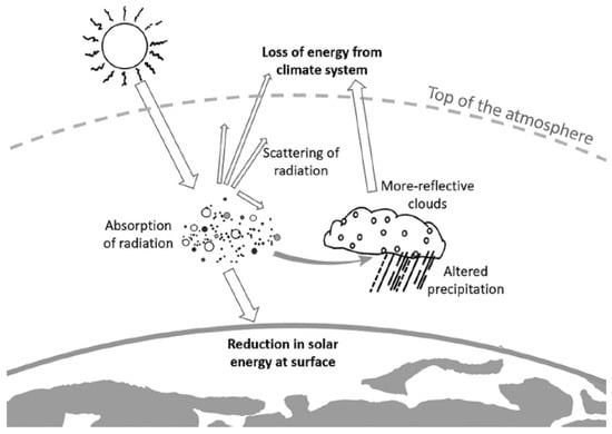 Representation of the main effects of aerosols interacting with radiation and clouds. Source: Reprinted with permission from Mahowald & Carslaw (2022) []. © 2022 Elsevier B.V. All rights reserved.
