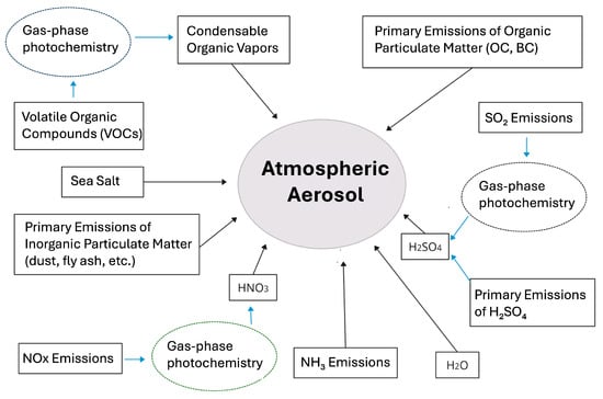 Atmospheric aerosols originate from a variety of sources, including natural processes such as sea spray, mineral dust, volcanic activity, and biogenic emissions from vegetation and marine organisms, as well as anthropogenic activities such as combustion and industrial processes (e.g. Figure 3). These aerosols can be classified as primary [] when they are directly emitted into the atmosphere or secondary when they are formed through chemical transformations of condensable precursor gases. Primary emissions, which are predominantly natural, dominate the total global aerosol mass and consist of particles larger than in diameter, such as mineral dust and sea spray aerosols. Secondary aerosols, in turn, result from the physicochemical transformation of volatile organic and inorganic compounds, which activate particles in the liquid or solid phases [].