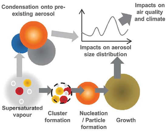 Gas-to-particle conversion processes and the impact of atmospheric vapors on aerosol particle formation and growth. Source: Reprinted with permission from Vehkamaaki and Riipinen (2012) []. © 2012 Royal Society of Chemistry (RSC). All rights reserved.