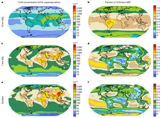 CCN concentrations and NPF contributions at different altitudes in 2016. (a,c,e) CCN concentrations at 0.5% supersaturation (CCN0.5%) at 13 km (a), 1 km (c), and surface level (e). (b,d,f) Fraction of CCN0.5% from NPF at 13 km (b), 1 km (d), and surface level (f). All values are normalized to standard temperature and pressure. Maps generated using NCAR tools. Source: Reprinted from Zhao et al., 2024 []. Licensed under CC BY 4.0.