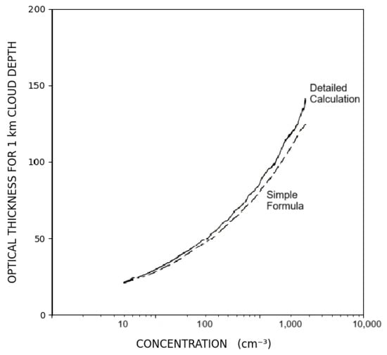 Relationship between the particle concentration per cubic centimeter and optical thickness for a cloud depth of 1 km. Source: Adapted with permission from Twomey (1977) []. © 1977 American Meteorological Society. All rights reserved.
