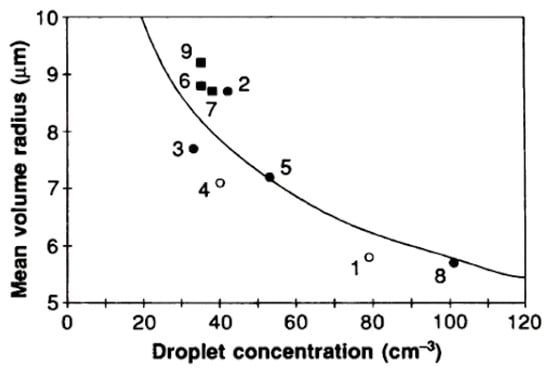 Relationship between the droplet concentration per cubic centimeter and the average volume of the droplet radius. Source: Reprinted with permission from Albrecht (1989) []. © 1989 American Association for the Advancement of Science. All rights reserved.