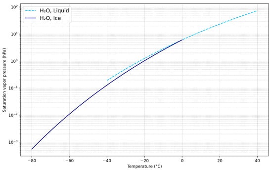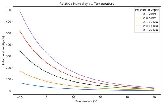 The maximum amount of water vapor that the atmosphere can hold, called the saturation vapor pressure, is primarily determined by temperature, as described by the Clausius–Clapeyron relation. Although the saturation vapor pressure depends almost exclusively on temperature and increases rapidly with it, the actual vapor pressure varies more slowly as a function of temperature []. During the adiabatic ascent of air, the temperature decreases, causing an approximately exponential reduction in the saturation vapor pressure. Since the absolute vapor content (actual vapor pressure) remains practically constant, the relative humidity progressively increases until saturation is reached, at which point condensation may occur [,]. The saturation vapor pressure was calculated using the formulation recommended by the World Meteorological Organization (WMO) [], based on Goff (1957) [] (Figure 8):