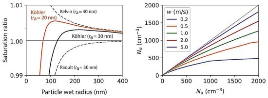 Köhler curve and the hydrometeor activation process. On the left: the rate of environmental saturation as a function of particle size is shown. On the right: the droplet number concentration (Nd) after activation as a function of the sulfate aerosol number concentration for different vertical wind speeds. Source: Reprinted with permission from Quaas e Gryspeerd (2022) []. © 2022 Elsevier B.V. All rights reserved.