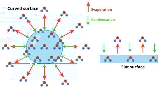 The Kelvin effect has a direct relationship with the surface tension of droplets and indicates that the higher the curvature, meaning the smaller the droplet, the higher the relative humidity must be to promote droplet growth (>100%), as curved droplets have higher saturation rates than flat surfaces (where saturation = 100%) [,,]. This is due to the surface tension effect or curvature effect, through which the surface of small droplets more easily releases molecules into the air, promoting evaporation and reducing the surface tension of the droplets (e.g., Figure 10) []. This effect shows that, at any temperature, the vapor pressure of saturation over a spherical surface, such as a water droplet, is higher than over a flat surface [], as lower surface tension requires extra energy to increase the surface area as the droplet grows at a constant temperature [,,].