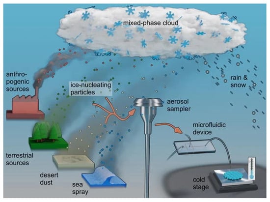 In this context, Hill et al. (2014) [] demonstrated that bacteria with ice nucleation activity (INA) exhibit high genetic diversity, with 18 alleles of the ina gene identified, and occur at high concentrations on cereal leaves ( genes ). Although these INA bacteria represented only a fraction of IN in snow samples at , their contribution was significant during a hail event ( 0.3 INA/IN), suggesting that under certain conditions, they may play a relevant atmospheric role. In one of the pioneering studies, Maki (1974) [] demonstrated that strains of Pseudomonas syringae, isolated from alder leaves, are highly efficient ice nucleators, capable of initiating freezing at relatively warm temperatures ( to ), with nucleating activity strongly associated with intact bacterial cells at high concentrations (107–108 cells/mL).