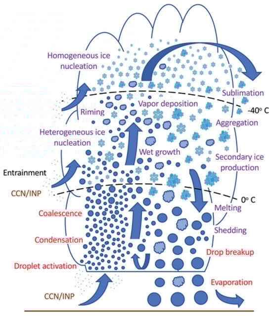 - Gupta, A.K.; Deshmukh, A.; Waman, D.; Patade, S.; Jadav, A.; Phillips, V.T.J.; Bansemer, A.; Martins, J.A.; Gonçalves, F.L.T. The microphysics of warm-rain and ice-crystal precipitation processes in simulated continental convective storms. Earth Environ. Commun. Nat. 2023, 4, 226. [Google Scholar] [CrossRef]