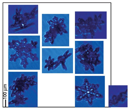 - Bailey, M.; Hallett, J. Growth Rates and Habits of Ice Crystals between −20° and −70 °C. J. Atmos. Sci. 2004, 61, 514–544. [Google Scholar] [CrossRef]