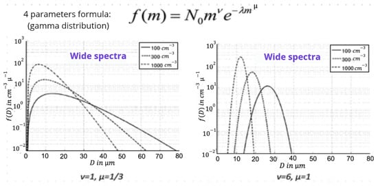 Figure 7 presents an inverse relationship between the droplet radius and the concentration of these hydrometeors, indicating that as the effective radius of cloud droplets increases, their concentration decreases, while smaller radii correspond to higher concentrations. The droplet concentration was measured as a function of the average volume of the droplet radius r for different sizes in the range of to m for a given liquid water content L and numerical density N, with , where is the water density, which was kept constant.