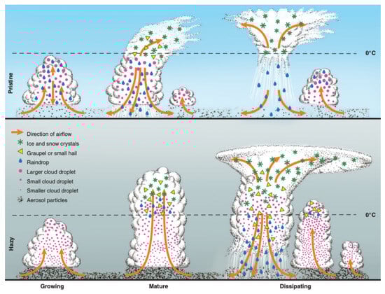 In this context, a study by Jiwen Fan et al. (2013) [] provides a comprehensive analysis of how aerosols affect deep convective cloud (DCC) coverage, cloud-top height, and radiative forcing. The authors observed that even without thermodynamic growth, associated with additional latent heat release during freezing, aerosols significantly impact cloud evolution. This impact is linked to the microphysical effect of aerosols, which plays a crucial role in the maturity and dissipation stages of clouds, leading to a significant increase in cloud coverage and thickness while promoting the formation of smaller and more persistent ice particles in the stratiform regions of DCCs. The analyses indicate that the thermodynamic effect contributes approximately 27% to the total increase in cloud coverage, while the indirect aerosol effect manifests as atmospheric radiative heating of 3– and surface cooling between and . These findings were corroborated by extensive measurements conducted in three different environments.