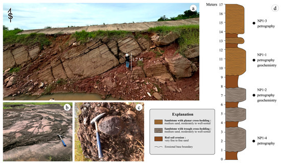 The investigated section of the Nam Phong Formation at site NP1 (16°39′12.4″ N, 102°31′47.1″ E), located in Khon Kaen Province, northeastern Thailand, comprises a 16.5 m thick, continuous exposure dominated by medium-grained sandstone with prominent sedimentary structures (Figure 1a and Figure 2a–c). Situated in the central Khorat Plateau, this section represents a typical stratigraphic succession of the Nam Phong Formation.