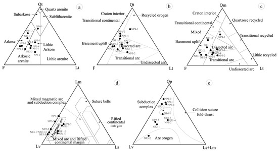 Further resolution is provided by the Lm–Lv–Ls diagram (Figure 4d) [27], where samples are broadly distributed within the “mixed magmatic arc and subduction complex” and “suture belt” fields. Additionally, the Qp–Lv–(Ls+Lm) diagram (Figure 4e) [28] shows clustering within the “collision suture fold-thrust” and “arc orogen” fields.