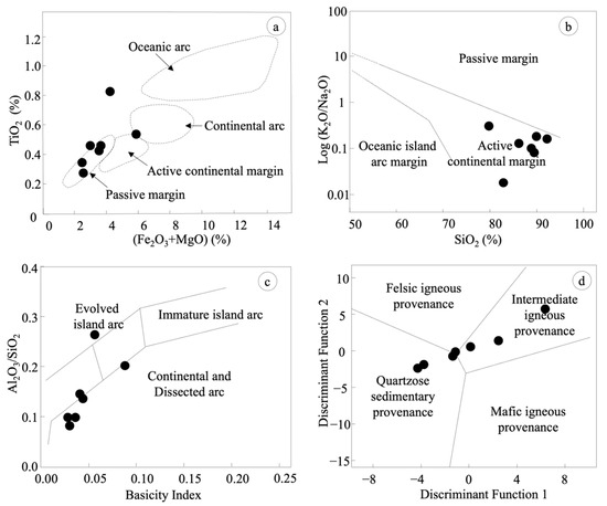 Major oxides discrimination diagrams for sedimentary rock samples used to infer provenance, tectonic setting, and source composition. (a) Discrimination diagram of (Fe2O3 + MgO) vs. TiO2 [31] used to identify tectonic setting. (b) K2O/Na2O vs. SiO2 [32], a tectonic setting discrimination. (c) Basicity Index vs. Al2O3/SiO2 plot [33,34] used to differentiate between evolved and immature island arcs and continental settings. (d) Discriminant Function Analysis plot [35]. Filled black circles represent individual samples analyzed. Fields and trends are based on published classification schemes for sedimentary rocks and tectonic settings.