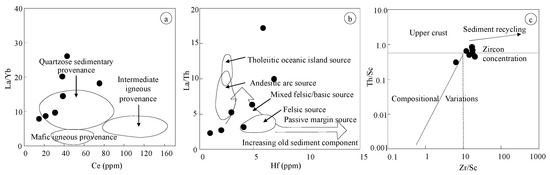 Trace elements discrimination diagrams for sedimentary rock samples used to infer provenance, tectonic setting, and source composition. (a) La/Yb vs. Ce diagram [36] for sedimentary provenance. (b) La/Th vs. Hf ratios [37] to constrain source composition and arc-type sediment input. (c) Th/Sc vs. Zr/Sc plot [38] indicating sediment recycling and zircon concentration trends. Filled black circles represent individual samples analyzed.