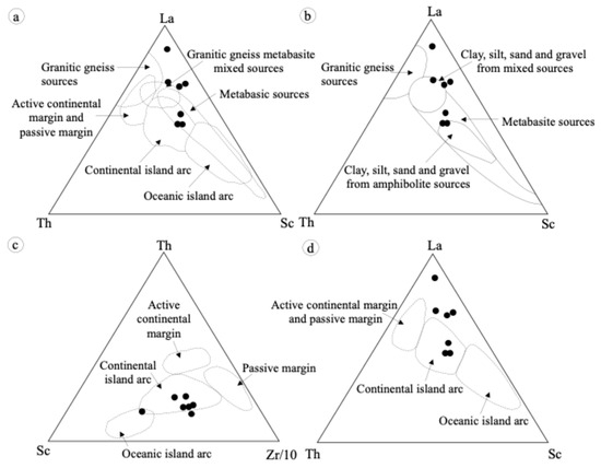 Ternary discrimination diagrams of sedimentary rock samples used to infer provenance, tectonic setting, and source composition. (a,b) La–Th–Sc diagrams [33,34] for provenance and tectonic discrimination. (c) Th–Sc–Zr/10 diagram [36] for tectonic setting and source characterization. (d) La–Th–Sc diagram [39] emphasizing tectonic environment and sediment source types. Filled black circles represent individual analyzed samples.