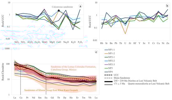 Geochemical normalized distribution patterns of the sandstone samples (NP1–1 to NP4). (a) Major element concentrations normalized to upper continental crust (UCC) values [40], showing enrichment and depletion trends, notably elevated CaO in the calcareous sandstone sample (indicated by a black star). (b) Trace element concentrations normalized to UCC values [40], indicating variable depletion/enrichment patterns, with significant U depletion in some samples. (c) REE patterns normalized to chondrite values [41]. The REE distribution of Shijia Sandstone [42], sandstones of the Khorat Group from Khon Kaen Geopark [6] (orange field), and sandstone of the Lomas Coloradas Formation, Cabullona Group, México (pale reed field) [43] is compared to UCC, Loei Volcanic Belt [44,45], suggesting similarities in source characteristics and sedimentary processes.