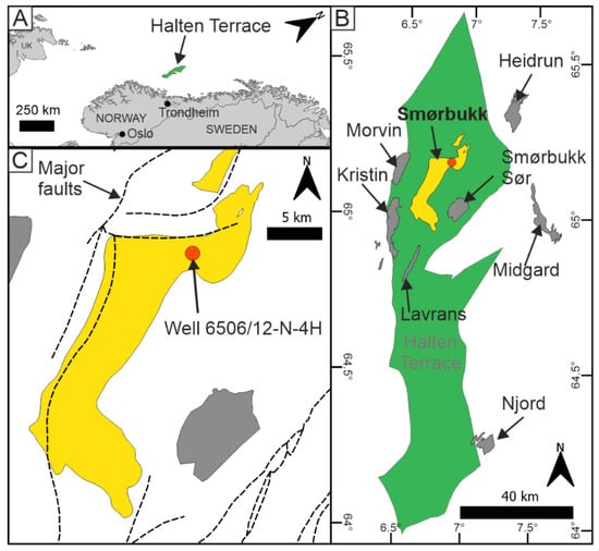 (A) Location of the Halten Terrace offshore mid-Norway. (B) Producing hydrocarbon fields within the Halten Terrace area. (C) Position of well 6506/12-N-4H within the Smørbukk field investigated in this study. Dashed lines represent major faults (data obtained from the Norwegian Offshore Directorate https://www.sodir.no/en/about-us/open-data/, accessed on 17 August 2023; modified after [18]).