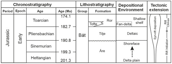 Summary of the Early Jurassic lithostratigraphy in the Halten Terrace area indicating approximate depositional environment and tectonic activity. The present study focuses on the top of the Tilje Formation in well 6506/12-N-4H (modified after [47]).