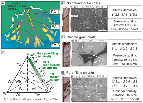The mineral chlorite is an important constituent of many clastic sedimentary rocks, as it can have a significant impact (both positive and negative) on hydrocarbon field reservoir quality (porosity and permeability), as a function of its abundance and morphology. Chlorite can occur in the sedimentary environment as detrital grains, or develop in the diagenetic realm by the transformation of a precursor mineral such as smectite, kaolinite, or berthierine (an Fe-rich clay) to form authigenic chlorite [1,2,3,4,5]. Present in moderate quantities, chlorite can preserve porosity by forming grain coats that serve to inhibit quartz cementation by acting as a barrier between a detrital grain and silica-rich pore fluid, which might otherwise precipitate quartz on the quartz substrate during meso-diagenesis (>80 °C) [4,6,7,8]. The absence of chlorite may allow extensive quartz cementation to occur, degrading reservoir quality. A sandstone may contain too much chlorite so as to fill pores and block pore throats, reducing permeability just as extensive quartz cementation would. Therefore, a ‘Goldilocks zone’ sweet spot of chlorite content (not too little but not too much) must be present in the rock to mitigate negative effects and maximise porosity preservation [9]. Chlorite grain coats have been reported to form in sediments from almost every clastic sedimentary environment in a variety of basins [1,10]. Indeed, they are responsible for elevated porosity at depth (>3 km) in a large number of oil and gas fields globally [5,11,12] such as the Ordos Basin in China [13,14], the Gulf of Mexico [12], and the North Sea [15,16,17,18,19,20]. Therefore, advancing our understanding of the origin and improving the prediction of the distribution of grain-coating chlorite in sandstones is crucial for reservoir appraisal and development in chlorite-rich intervals found across the world.