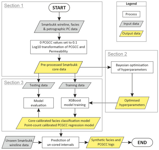In this study, we present predictive machine learning regression models, which predict continuous variables, and a classification model that predicts a discrete class-based variable. To train predictive machine learning models, we have opted to use the supervised decision tree-based Extreme Gradient Boosting (XGBoost) algorithm in RStudio [52,53] available through the ‘xgboost’ package and tools within the ‘tidymodels’ package for hyperparameter optimisation [54,55]. XGBoost was chosen as some studies show that it is able to outperform other algorithms, specifically in geophysical prediction models [56,57]. The workflow employed to train models has been adapted from Houghton, Nichols, Griffiths, Simon, Utley, Duller and Worden [38] and Nichols, Worden, Houghton, Duller, Griffiths and Utley [37] who predicted the sub-depositional environment and estuarine zone in a modern estuary using bulk sediment grain size characteristics and geochemistry. The workflow has been adapted here to use wireline log data obtained from well 6506/12-N-4H as predictors for permeability regression (Model C), lithofacies classification (Model A), and point-counted grain-coating chlorite regression (Model E) as outlined in previous sections. Regression models C and E used the evaluation metric RMSE (Table 3) as the objective metric to minimise during hyperparameter optimisation, and model training and testing.