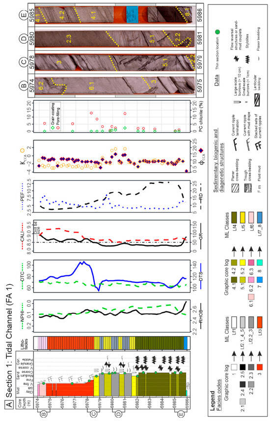 (A) Composite wireline log data of the tidal channel facies association (FA1) in well 6506/12-N-4H with graphic sedimentary log, conventional core analysis porosity (φCCA) and permeability (KCCA), and petrographic point count data for grain coating (green diamonds) and pore-filling (red circles) chlorite abundance. Core photographs of: (B) 5974 to 5975 mRKB; (C) 5978 to 5979 mRKB; (D) 5980 to 5981 mRKB; and (E) 5985 to 5986 mRKB showing each of the lithofacies in this reservoir section.