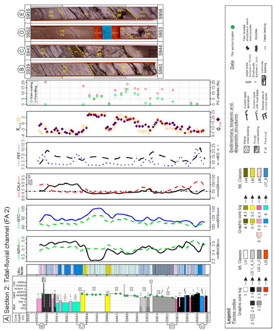 The tidal-fluvial channel facies association (FA2; Figure 6) is highly heterogeneous, containing thin beds (0.2 to 0.8 m) of non-reservoir lithofacies 2.1, 2.4, 2.5, 5, 6, 7, 8, which host pore-filling chlorite due to the mud-rich nature of the sediments (Table 1; Figure 3E). Reservoir Section 3 hosts lithofacies 1 and 2.2 as thick beds (2 to 4 m), which have marked increases in grain-coating chlorite, leading to elevated porosity and permeability compared to other facies (Figure 3).