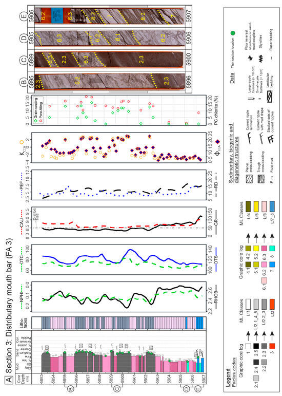 Griffiths et al. [18] reported that the three described reservoir intervals constituted three different facies associations: tidal channel (FA1), tidal-fluvial channel (FA2), and distributary mouth bar (FA3) (Figure 3A). The three facies associations were made up of eight lithofacies, which were further split into fourteen sub-facies, distinguished by variations in bioturbation type and intensity (after [50]), grain size, sedimentary structures, and bedding style (Table 1). Within well 6506/12-N-4H, the intervals characterised are interpreted to represent a shift from being tidally-dominated (reservoir Section 1), to mixed tidal-fluvial (reservoir Section 2), to fluvially-dominated (reservoir Section 3) as a result of variability in seasonal rainfall, autogenic lobe switching, eustatic sea-level change, and tectonically-generated accommodation space (Figure 3) [18,49,51].