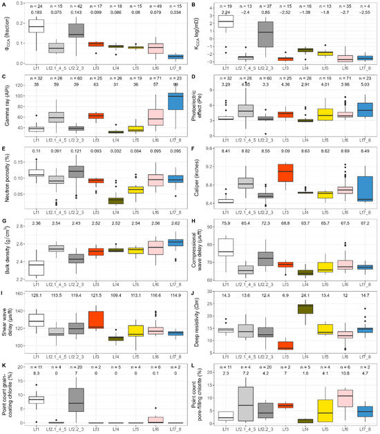 Boxplots of core analysis properties, (A) porosity, (B) log-permeability, wireline parameters: (C) Gamma ray; (D) Photoelectric effect; (E) Neutron porosity; (F) Caliper; (G) Bulk density; (H) Compressional wave delay; (I) Shear wave delay; (J) Deep resistivity. Petrographic point count abundance of (K) grain-coating chlorite, and (L) total chlorite as a function of lithofacies. Numbers at the top of each sub-plot are sample numbers (n = x) and the median values of each parameter for each lithofacies. Sample numbers for sub-plots C to J are the same.