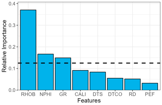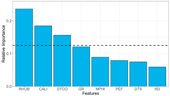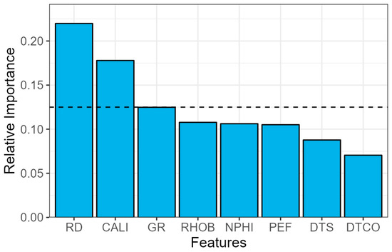 Relative importance of each wireline parameter in reducing error when training Model C. The bars above the dashed line represent variables that are above-average contributors to error reduction. (RD = deep resistivity; CALI = caliper; GR = gamma ray; RHOB = bulk density; NPHI = neutron porosity; PEF = photoelectric effect; DTS = shear wave delay; DTCO = compressional wave delay).