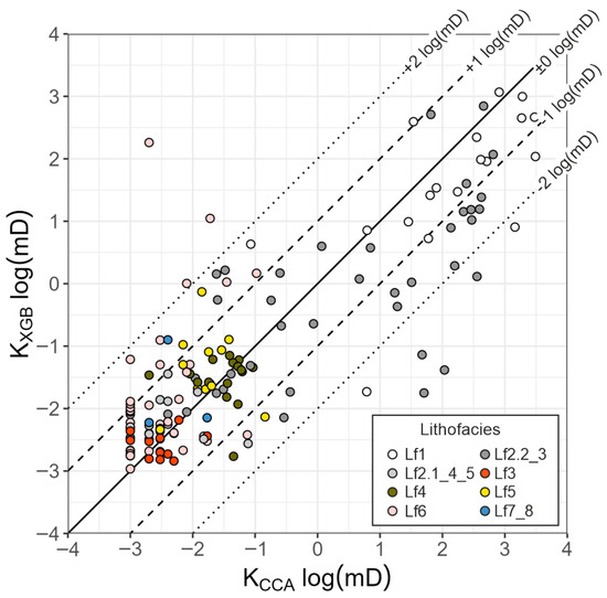 Cross-plot of XGBoost predicted core analysis permeability values (KXGB) vs. measured values (KCCA), shape-coded for the observed lithofacies of each sample.