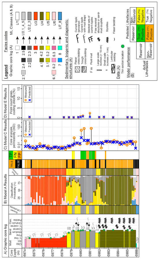 Lithofacies classification logs for reservoir Section 1 (Facies association 1) between 5974 and 5986 mRKB. Shown is (A) a graphic core log indicating grain size, the presence of sedimentary, biogenic, and diagenetic structures, and point-counted thin section samples alongside the assigned lithofacies label for each wireline measurement interval. (B) An amalgamation of test results for Model A showing the probability of a given lithofacies label for each interval; the most probable lithofacies label for that wireline interval; a log indicating whether the most probable lithofacies label assigned by the Model A is ‘true’ or ‘false’; an indication of whether a prediction of Lf1 or Lf2.2_3 is a true positive (TP), false negative (FN) or false positive (FP). True negatives are left blank. (C) Amalgamated results of Model C core analysis permeability regression prediction. (D) Amalgamated results of Model E point count grain coating chlorite regression prediction.