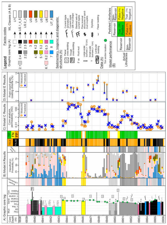 Lithofacies classification logs for reservoir Section 2 between 5942 and 5959 mRKB. Shown is (A) a graphic core log indicating grain size, the presence of sedimentary, biogenic, and diagenetic structures, and point-counted thin section samples alongside the assigned lithofacies label for each wireline measurement interval. (B) An amalgamation of test results for Model A showing the probability of a given lithofacies label for each interval; the most probable lithofacies label for that wireline interval; a log indicating whether the most probable lithofacies label assigned by the Model A is ‘true’ or ‘false’; an indication of whether a prediction of Lf1 or Lf2.2_3 is a true positive (TP), false negative (FN) or false positive (FP). True negatives are left blank. (C) Amalgamated results of Model C core analysis permeability regression prediction. (D) Amalgamated results of Model E point count grain coating chlorite regression prediction.