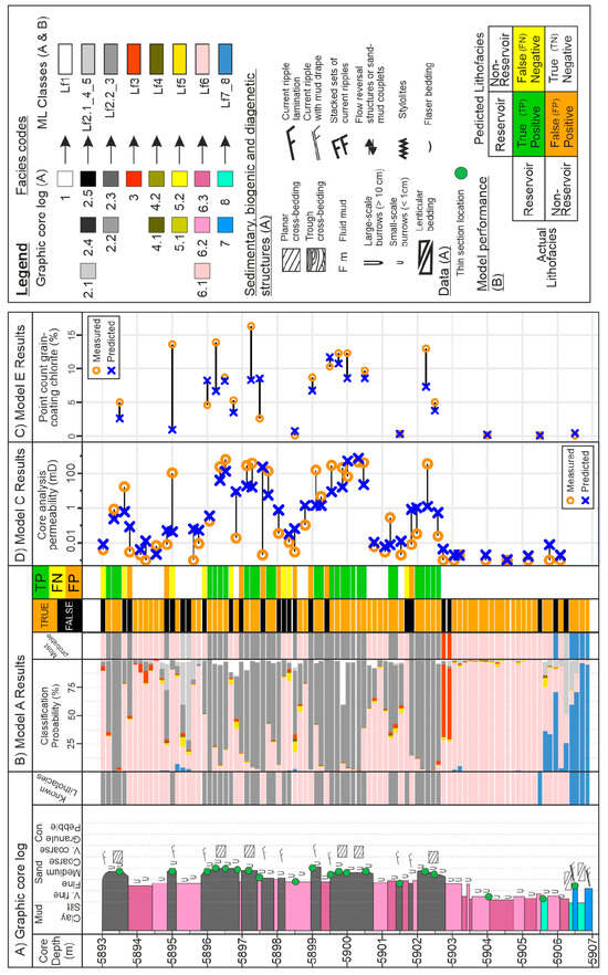 Lithofacies classification logs for reservoir Section 3 between 5893 and 5907 mRKB. Shown is (A) a graphic core log indicating grain size, the presence of sedimentary, biogenic, and diagenetic structures, and point-counted thin section samples alongside the assigned lithofacies label for each wireline measurement interval. (B) An amalgamation of test results for Model A showing the probability of a given lithofacies label for each interval; the most probable lithofacies label for that wireline interval; a log indicating whether the most probable lithofacies label assigned by the Model A is ‘true’ or ‘false’; an indication of whether a prediction of Lf1 or Lf2.2_3 is a true positive (TP), false negative (FN) or false positive (FP). True negatives are left blank. (C) Amalgamated results of Model E point count grain coating chlorite regression prediction. (D) Amalgamated results of Model C core analysis permeability regression prediction.