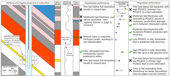 Thin beds at or below the resolution of wireline data acquisition, where lithofacies are interbedded with bed thicknesses of less than 30 cm, may be missed by the classification prediction, resulting in poor model performance compared to the core.