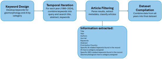 The retrieved articles were processed and converted into structured records, with metadata such as title, year, journal, author affiliation, keywords, and abstract extracted. A classification function assigned each article to one or more macro-categories within artificial intelligence and geomorphology, based on the co-occurrence of predefined tags within titles, abstracts, and keywords. A schematic overview of the data collection workflow is presented in Figure 1. The diagram outlines the main steps of the process: the design of domain-specific keywords for both geomorphology and artificial intelligence; the execution of yearly queries from 1990 to 2024; the filtering and classification of retrieved articles through automated parsing routines; and the compilation of a final dataset for analysis. The figure lists the key metadata extracted from each record, including bibliographic information, author country, and AI/geomorphological keywords grouped by thematic category.